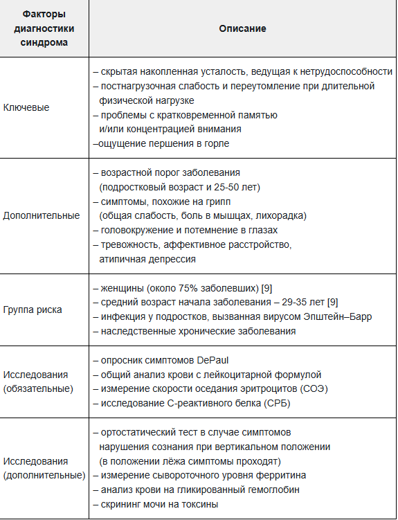 К основным диагностическим показателям относится неуклоняющаяся утомляемость, а также снижение трудоспособности минимум на 50% у лиц, ранее имевших нормальное состояние здоровья, продолжительностью не менее шести месяцев, при этом необходимо исключить наличие иных патологий, способных провоцировать длительную слабость.