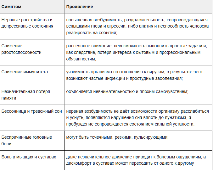1.Хроническая усталость неврологического происхождения — на первых порах проявляются лёгкие психоэмоциональные нарушения, снижающие работоспособность, нарушающие режим сна и 2.Ведущие к развитию мигреней и мышечных болей;